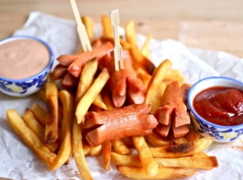 incluyen cada una papas, salchicha americana, queso fundido y queso cheddar.