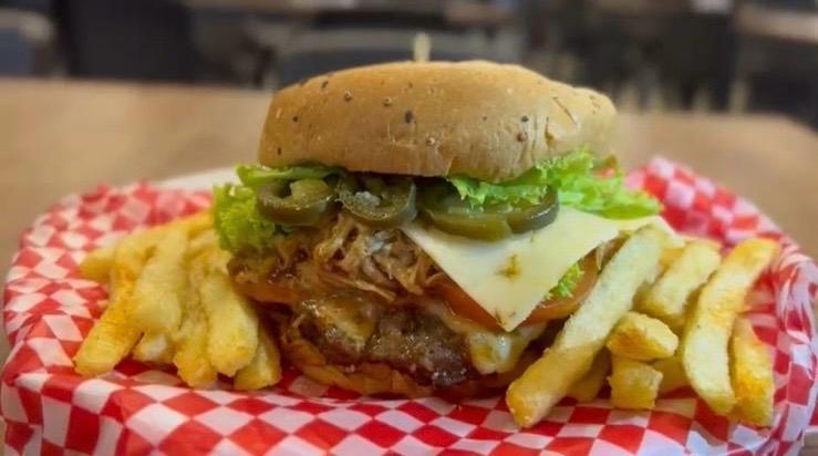 ¡Una hamburguesa con un toque picante! Pan, carne 180 g, pepper jack, chipotle, jalapeño, guacamole, cerdo BBQ, lechuga y tomate.