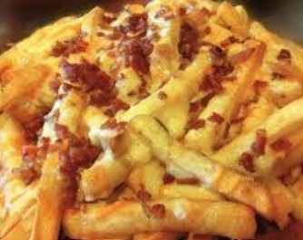 Una experiencia auténtica americana, papas, salchicha americana, tocineta y queso cheddar.