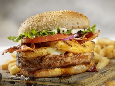 ¡Un viaje a las islas de Hawai en cada bocado! Pan, carne 180 g, queso, jamón, piña, tocineta, tomate, mayonesa y lechuga.