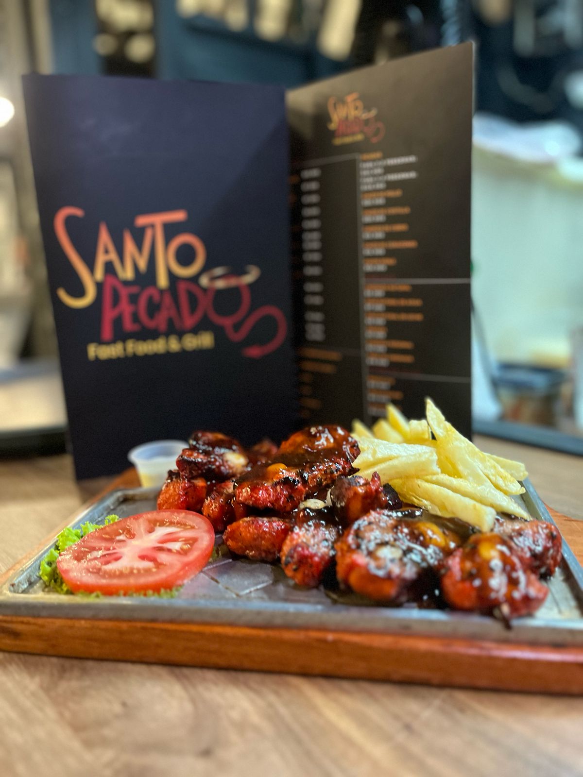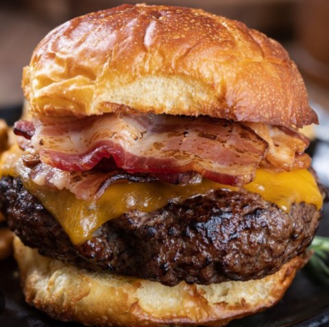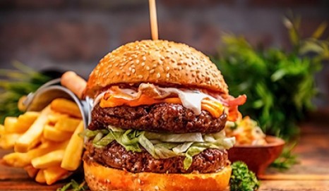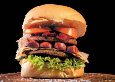 ¡La hamburguesa más pecaminosa! Pan, doble carne, doble queso, doble tocineta, cebolla, tomate, lechuga y salsas.