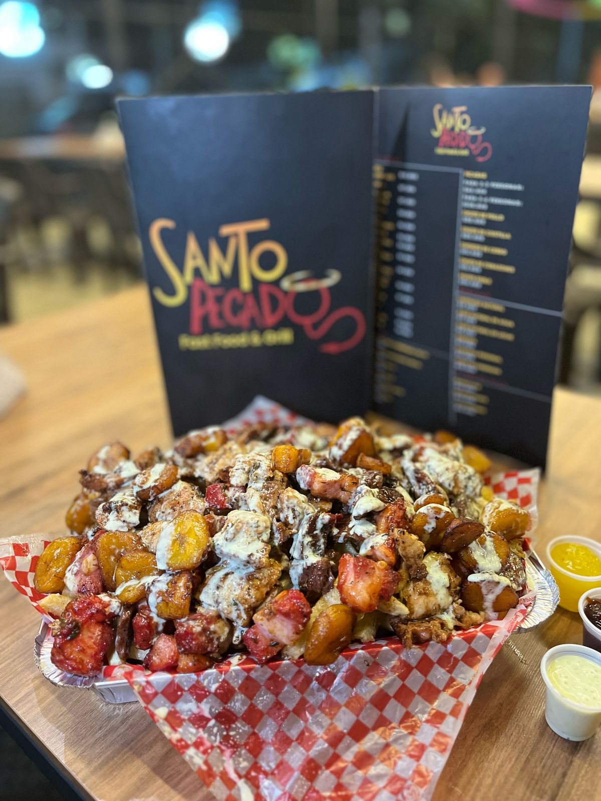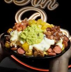 Una creación bellísima para una experiencia inolvidable, papas, salchicha ranchera, queso, carne, pollo, madura y guacamole.