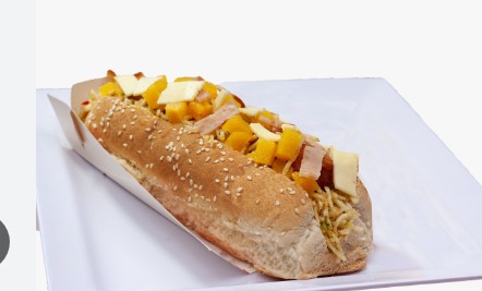 Una salchipapa llena de sabor y texturas que te dejará con ganas de más, papas a la francesa, salchicha, queso, cerdo desmechado, guacamole y tocineta.