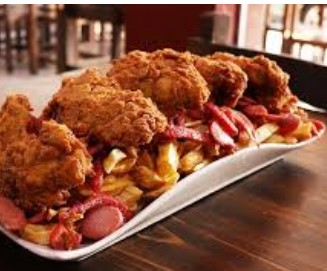 ¡La envidia de las pájaros! Papas, queso, pollo apanado y salchicha americana.