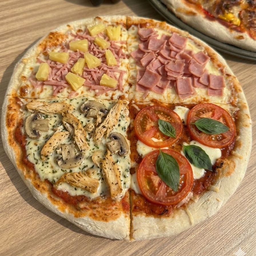 Deliciosa combinación clásica de jamón premium y piña dulce sobre una base de queso fundido y salsa de tomate artesanal.