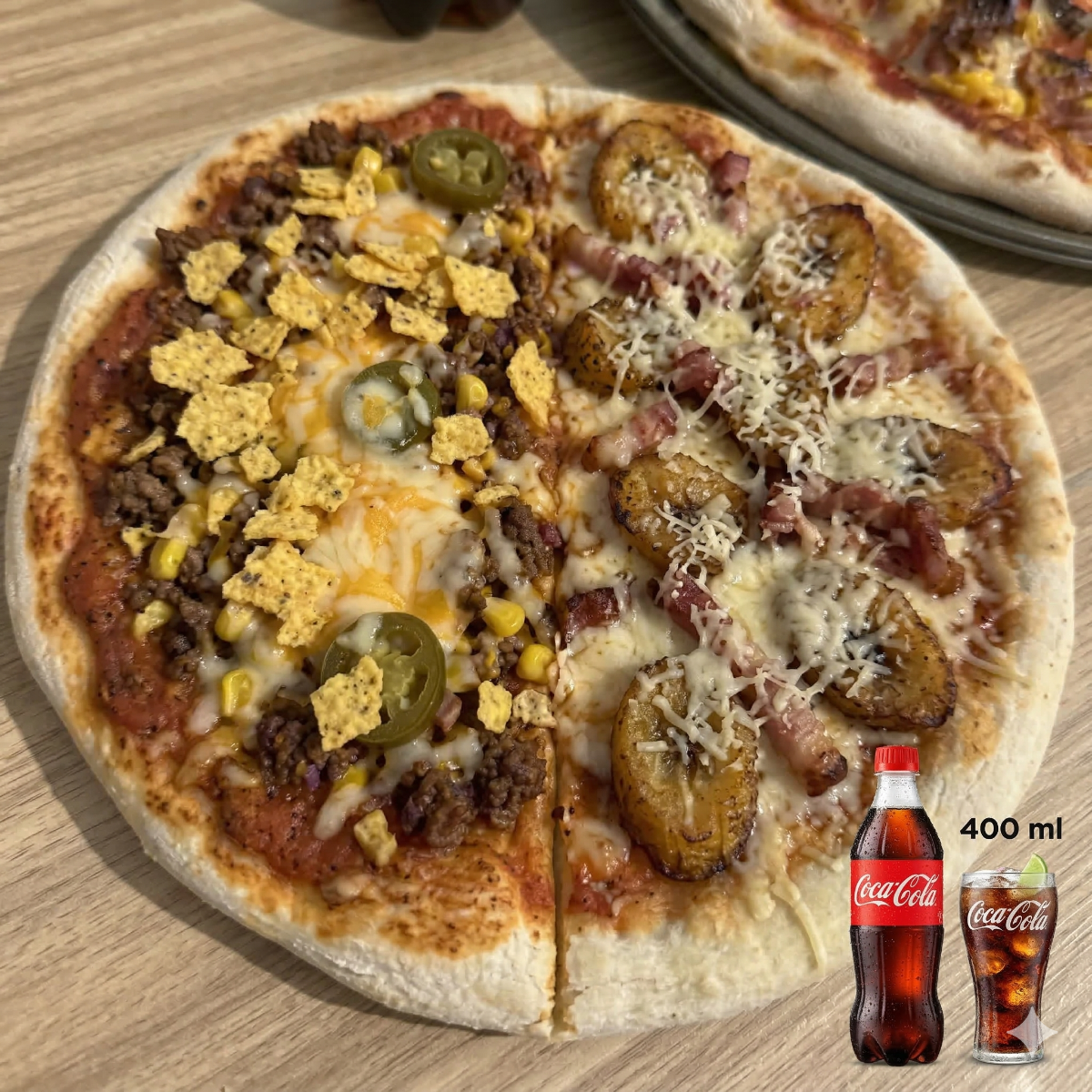 Combo de pizza especial (21 cm, 4 porciones) acompañada de una refrescante Coca Cola de 400 ml.