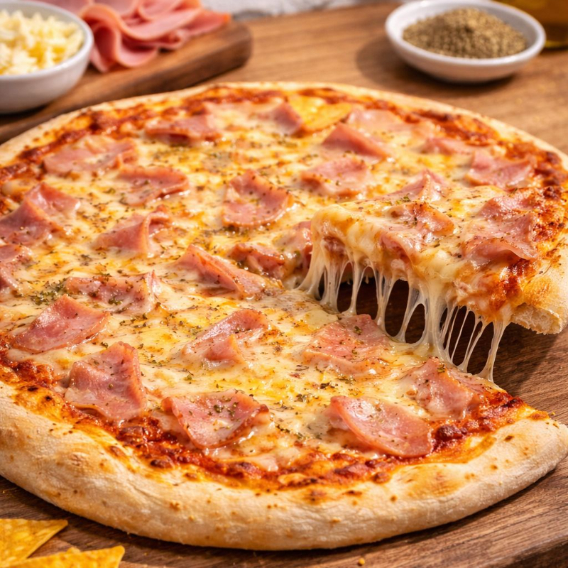 Tradicional pizza cargada con láminas de jamón de excelente calidad y una generosa capa de queso mozzarella fundido.