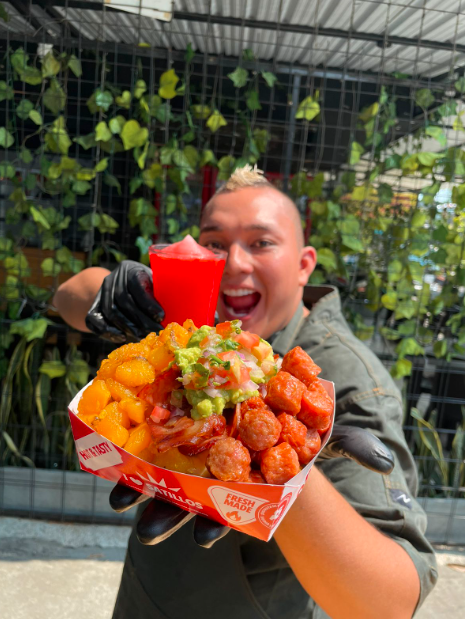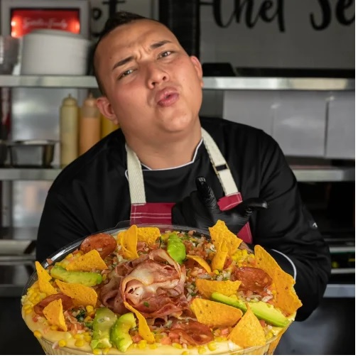 Salchipapa para 1 a 2 personas con papa a la francesa, salchicha sevilla, pollo y carne desmechada, ripio de papa, mezcla de tres quesos, maicitos, pico de gallo, peperonni, aguacate, nachos, tocineta ahumada.