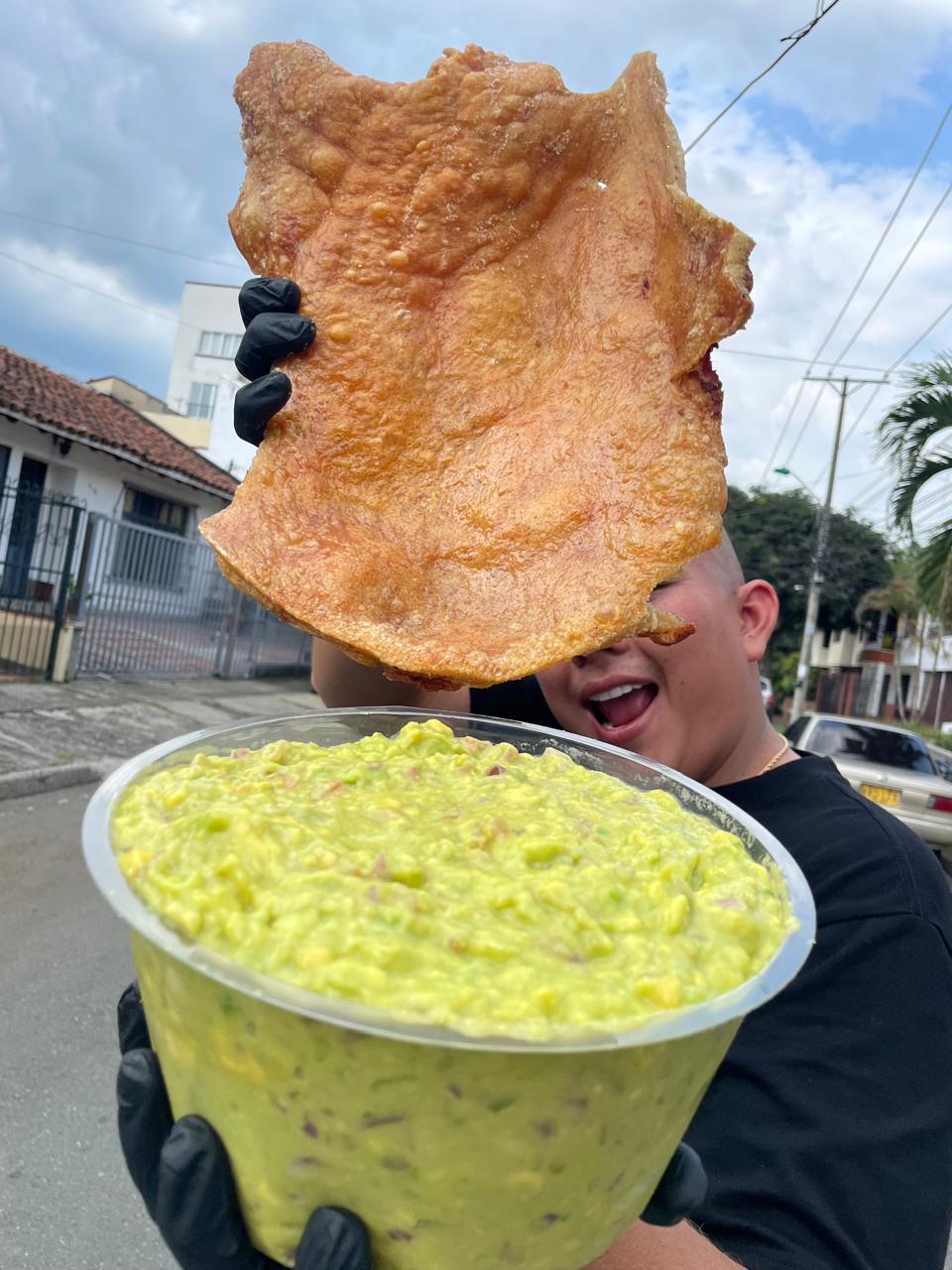 Empaque Bowl cartón, guacamole, 350 GRAMOS chicharrón partido en trocitos, tostada de plátano personal; se recomienda comprar tostadas adicionales.