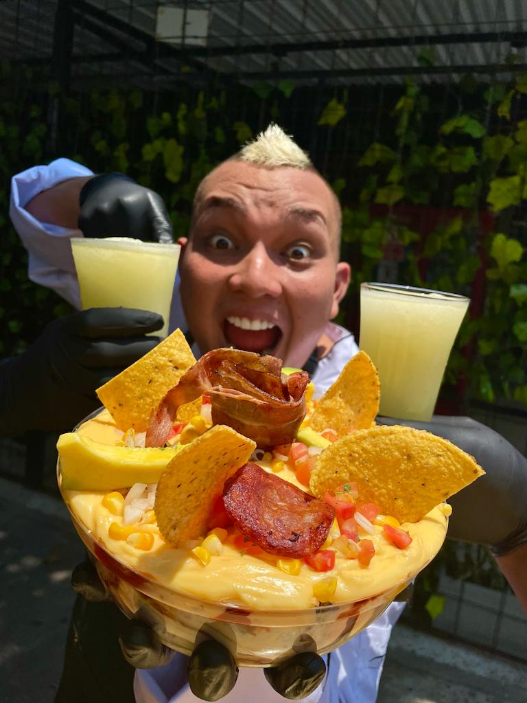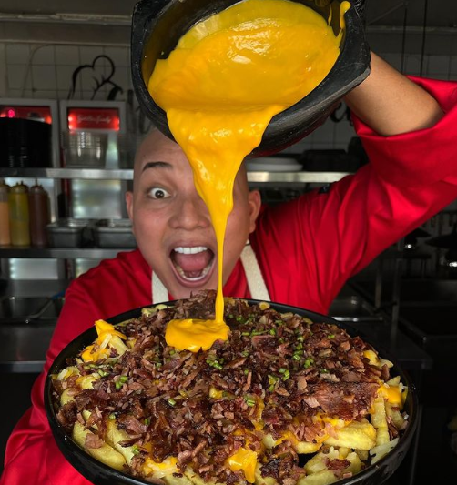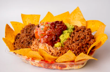 Mezcla de tres quesos de la casa cheedar mozarella y americano, pollo y carne desmechada en salsa polled pork, sour cream, pico de gallo, guacamole artesanal, frijol con chile, tocineta americana en trocitos y finas hierbas.