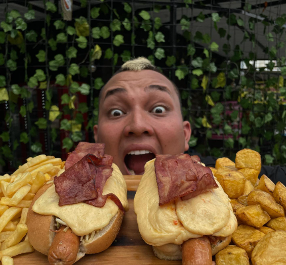 Pan brioche, lechuga, salchicha americana, ripio de papa, mezcla de tres quesos: cheddar, mozzarella y americano, tocineta ahumada.