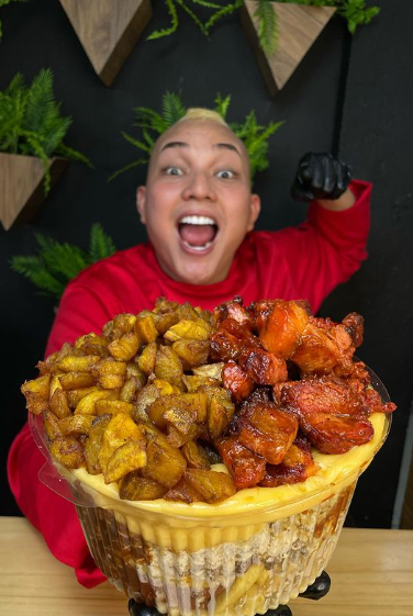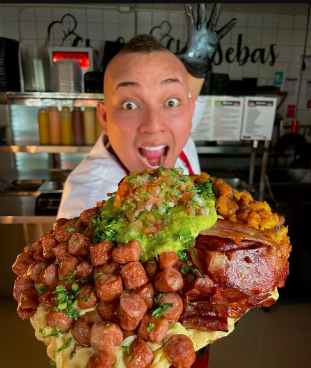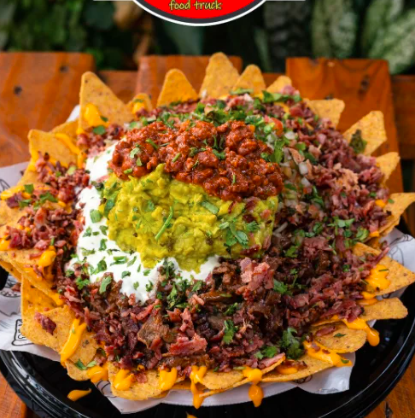 Base de lechuga, papa a la francesa, salchicha, mezcla de tres quesos de la casa, cheddar, mozzarella y americano, pollo y carne desmechada en salsa pulled pork, trozos de costilla ahumada en BBQ, chips de maduro, guacamole, pico de gallo artesanal, tocineta ahumada, viene con salsa rosada, chipotle, mostaza, tomate y de la casa.