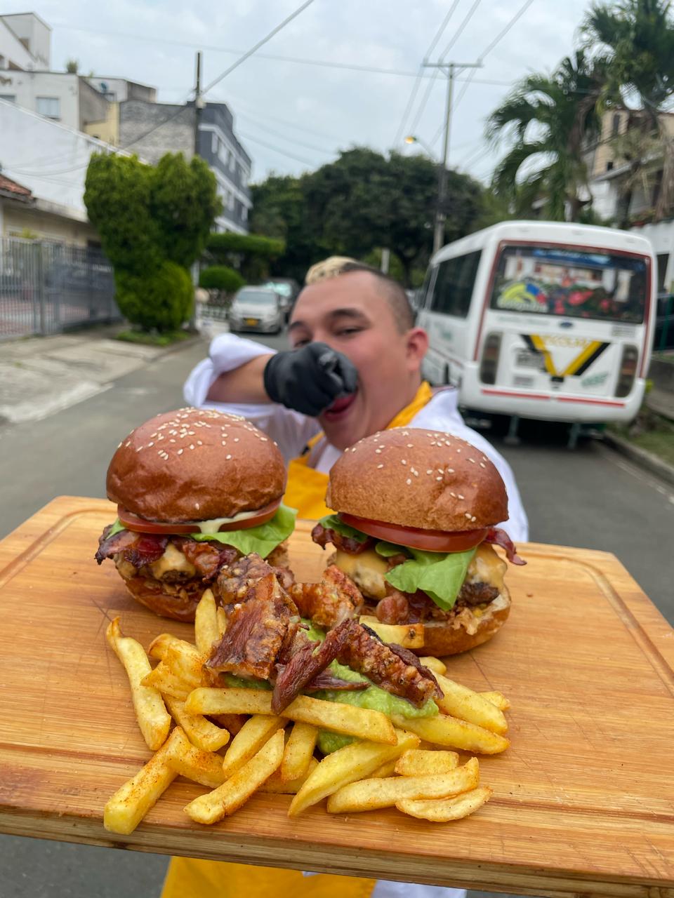 2 Hamburguesas (Carne angus, Queso americano tajado, Tocineta, Cebolla CRISPI, Pan brioche, vegetales y salsas) + Papás a la francesa con Guacamole y Chips de chicharrón al barril