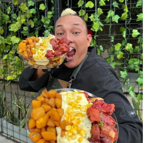 Papa criolla, salchicha Ranchera, pollo y carne desmechada en salsa BBQ, ripio de papa, mezcla de tres quesos, cheddar, mozzarella y americano, tocineta ahumada, chips de aguacate, viene con salsa rosada, chipotle, mostaza, tomate y de la casa.