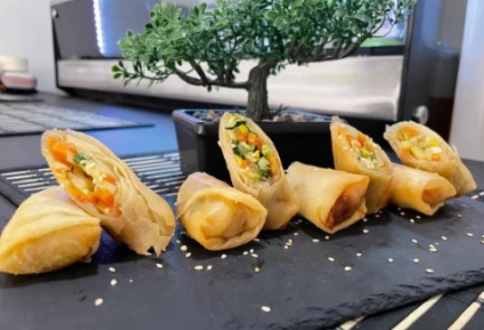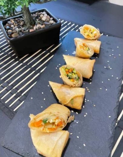 Rollo relleno frito relleno de vegetales salteados con tocineta.