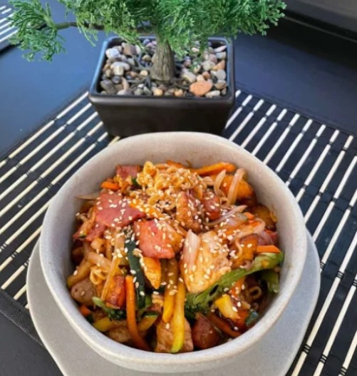 Caldo clásico japonés con zanahoria, brócoli, cebolla, zucchini, pasta ramen, huevo, camarón, calamar y palmito de cangrejo salteados en salsa del chef y ajonjolí.