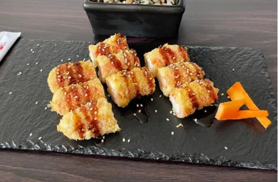 Camarón apanado queso crema y aguacate apanado por fuera con topping de kanikama en mayonesa de maracuya