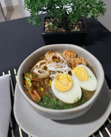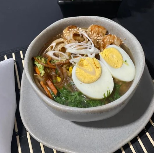 Sopa clásica japonesa con zanahoria, brócoli, cebolla, zucchini, pasta ramen, huevo, camarones salteado en salsa del chef y ajonjolí.