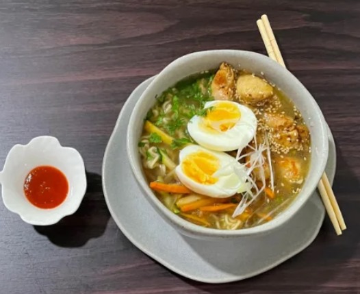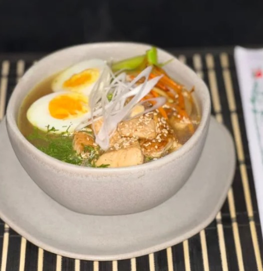Sopa clásica japonesa con zanahoria, brócoli, cebolla, zucchini, pasta ramen, huevo y pollo salteado en salsa del chef.