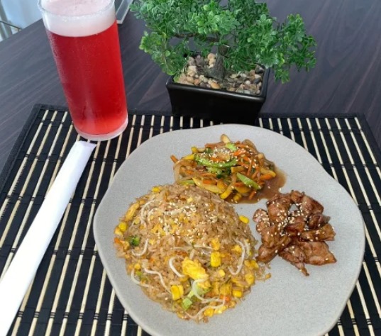 arroz frito vegetales salteados y pollo en salsa teriyaki