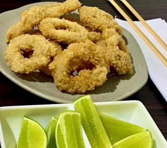 Calamar apanado queso crema y aguacate apanado por fuera con topping de ceviche de pescado blanko en salsa de aji amarillo