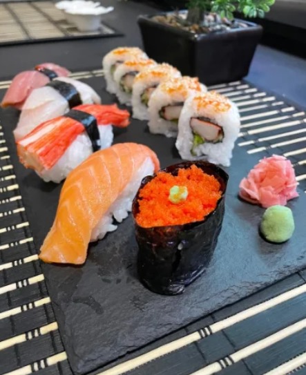 Medio rollo de sushi (sake o tuna maki) + 5 niguiris variados.