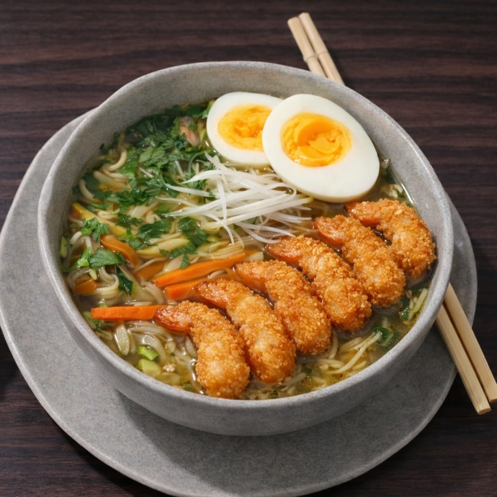 camarones apanados en panko huevo verduras pasta y caldo japones