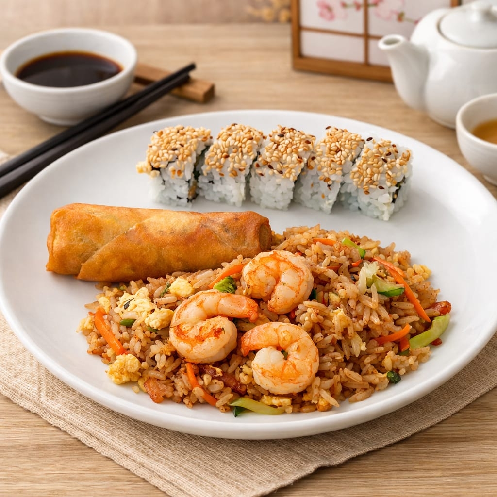 5 bocados de kani roll 1 lumpia de vegetales arroz yakimeshi con camaron y jamon