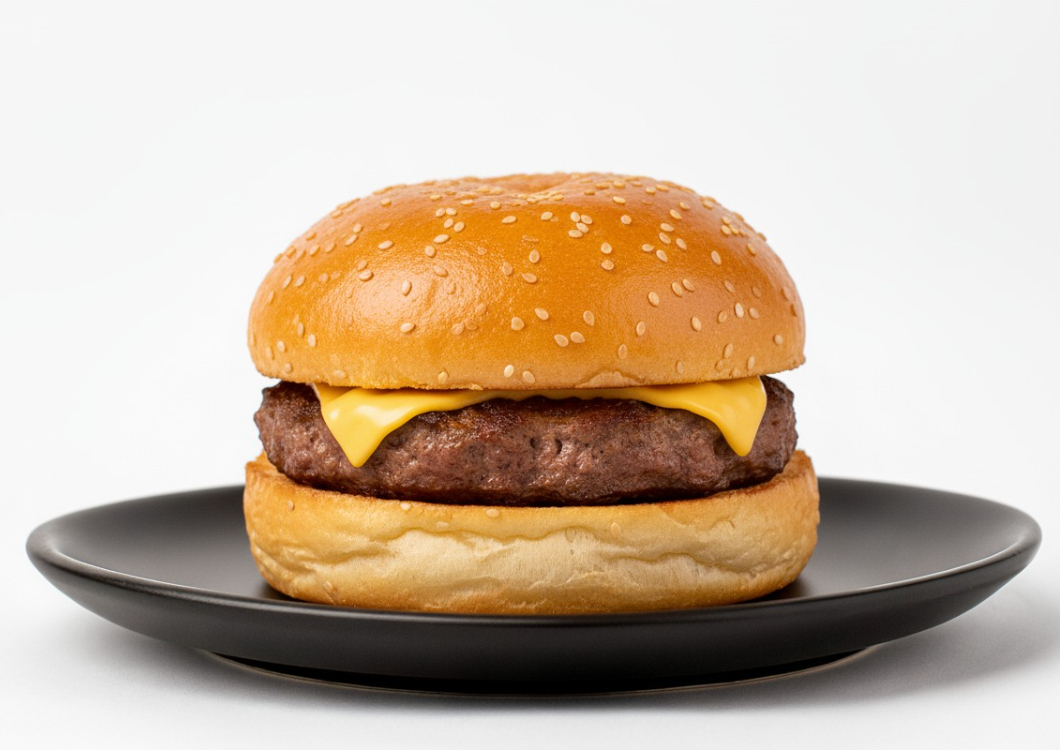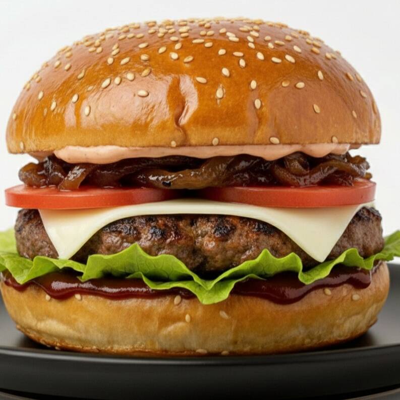 Pan brioche, lechuga, tomate, cebolla caramelizada, carne Angus (100 gr), queso y salsas.
