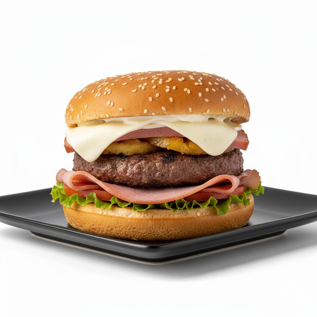 Pan brioche, lechuga, tomate, cebolla caramelizada, carne Angus (100 gr), queso, piña calada, jamón y salsas.