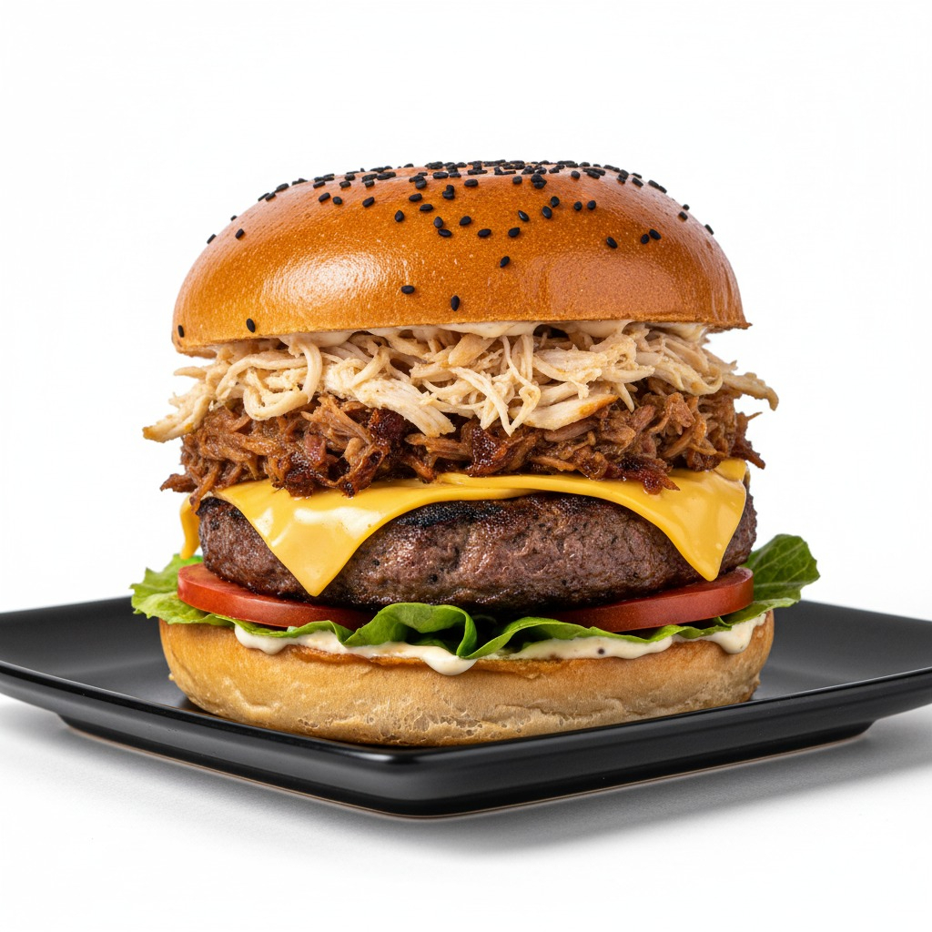 Pan brioche, lechuga, tomate, cebolla caramelizada, carne Angus (100 gr), queso cheddar, carne desmechada en salsa BBQ (50g), pollo desmechado (50gr), salsas.
