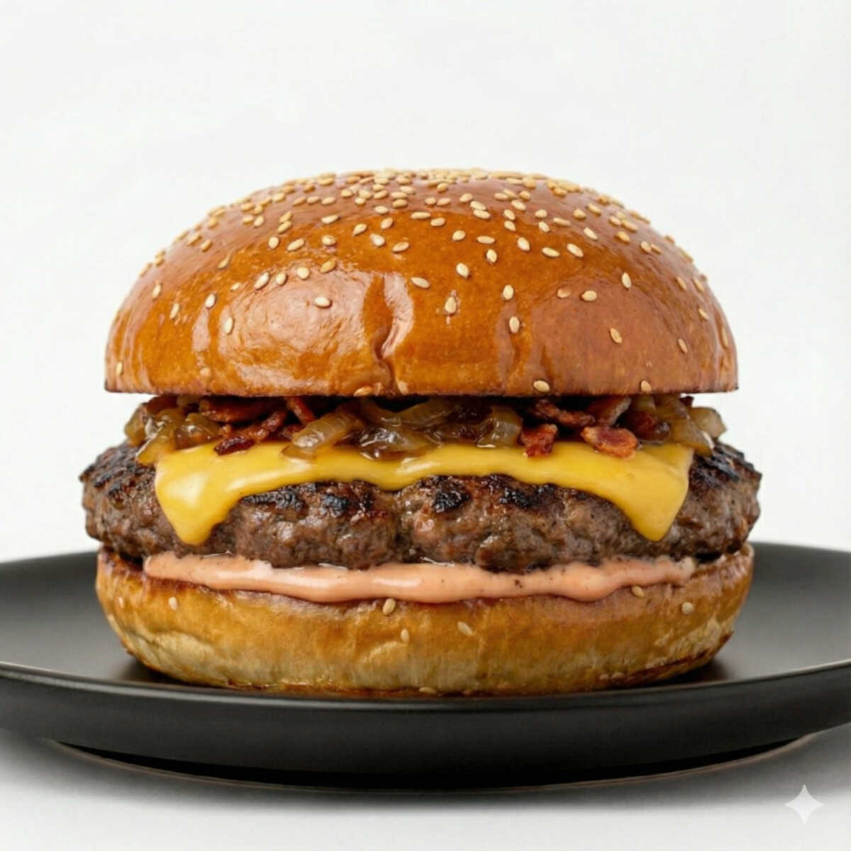 Pan hamburguesa, carne Angus (100 gr), Relish de cebolla caramelizada con trozos de tocineta y salsa de bbq dulce, queso cheddar y salsa de la casa.
