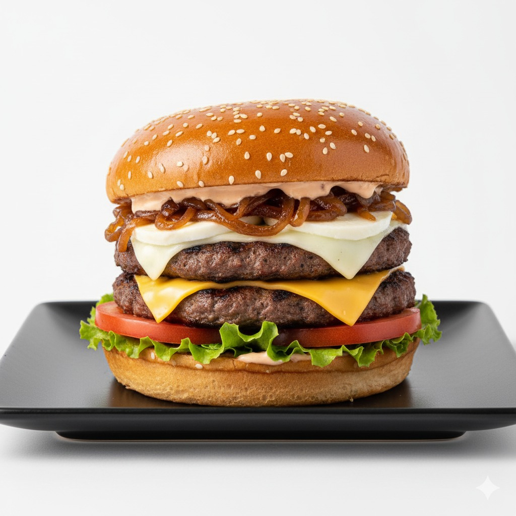 Pan brioche, lechuga, tomate, cebolla caramelizada, 2 carnes Angus (200 gr), queso doble crema, queso americano y salsas.