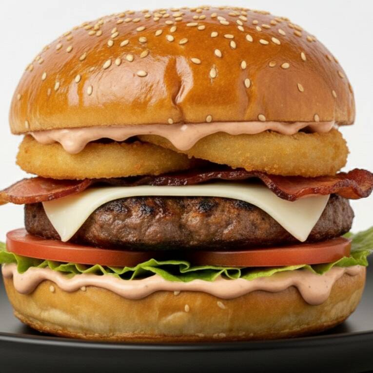 Pan brioche, lechuga, tomate, aros de cebolla (2 unds) , carne Angus (100 gr), queso tajado, tocineta y salsa sweet smoke.