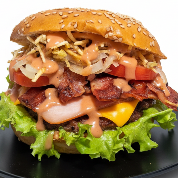 Pan brioche, lechuga, tomate, cebolla caramelizada, carne Angus (100 gr), queso americano, jamón, tocineta, papas fosforitos y salsa de la casa.