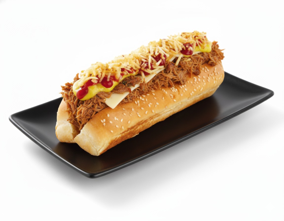 Imagen ilustrativa para que se vean todos los ingredientes / Pan perro, salchicha, bondiola desmechada en salsa BBQ y Pollo desmechado, salsa de la casa (sweet Smoke), salsa de ajo, salsa de piña, papas fosforito, 2 tajadas de queso.