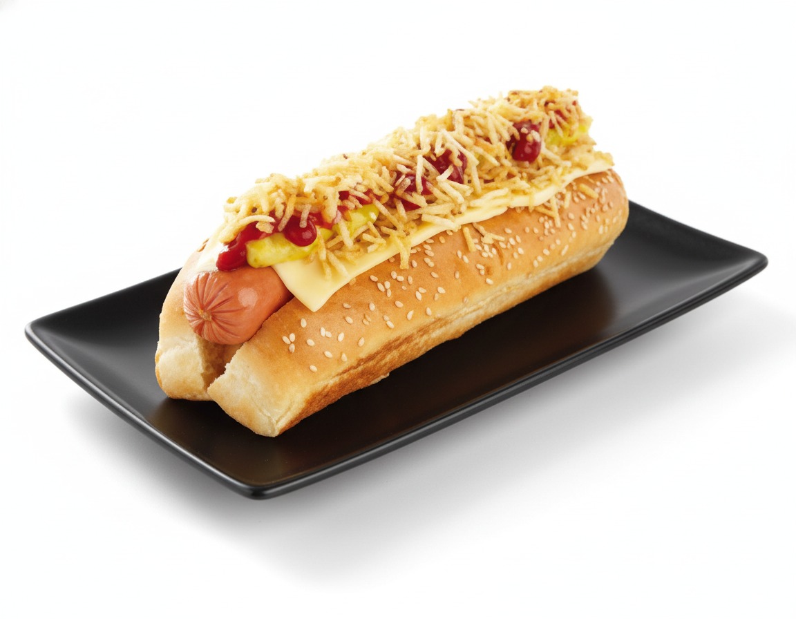 Pan perro brioche, Salchicha, Papas Fosforito, Salsa de la Casa, Salsa de Tomate, Mostaza y 1 tajada de Queso.