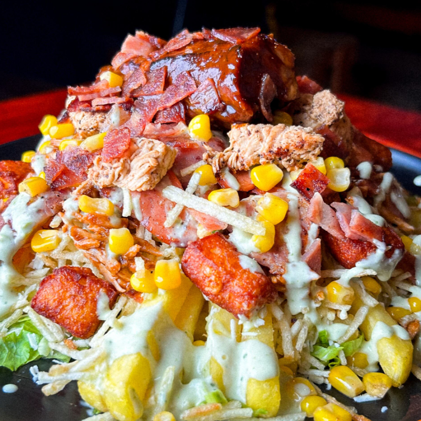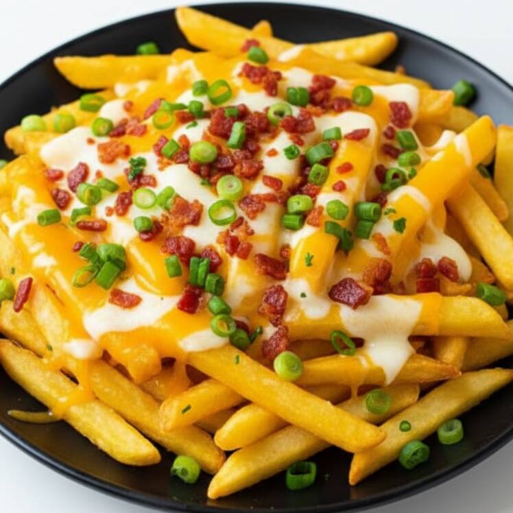 (200Gr) de Papas Fritas con especias de la casa, queso cheddar derretido, sour cream, tocineta picada, cebollín-(Bajo disponibilidad).