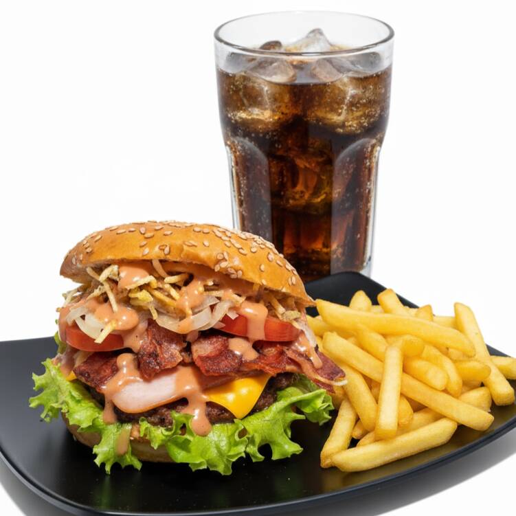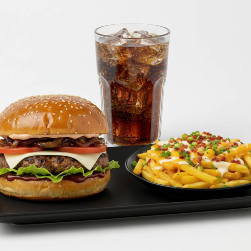 Hamburguesa clásica + cheese fries with bacon jr + gaseosa