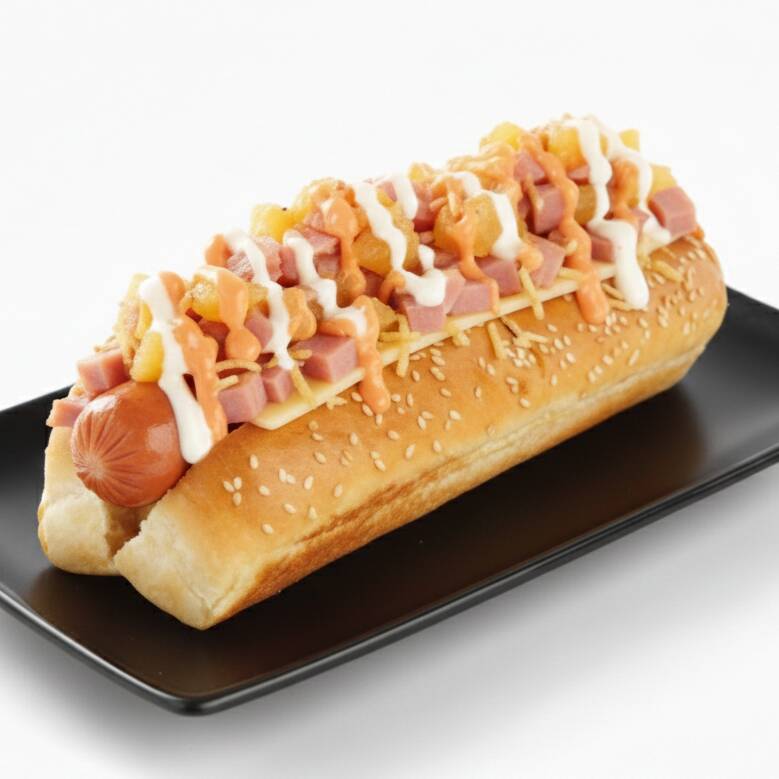 (Imagen ilustrativa), pan perro brioche, salchicha, piña calada, jamón en trocitos, papas fosforito, queso, salsa sweet smoke, salsa de piña y salsa de ajo.