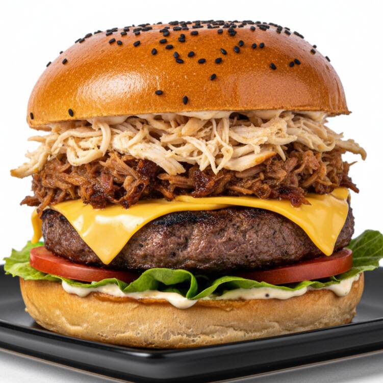 (la favorita de la casa) Pan brioche, salsa de ajo, lechuga, tomate, cebolla caramelizada, carne Angus (100 gr), queso cheddar, carne desmechada en salsa bbq, pollo desmechado, salsa sweet smoke..