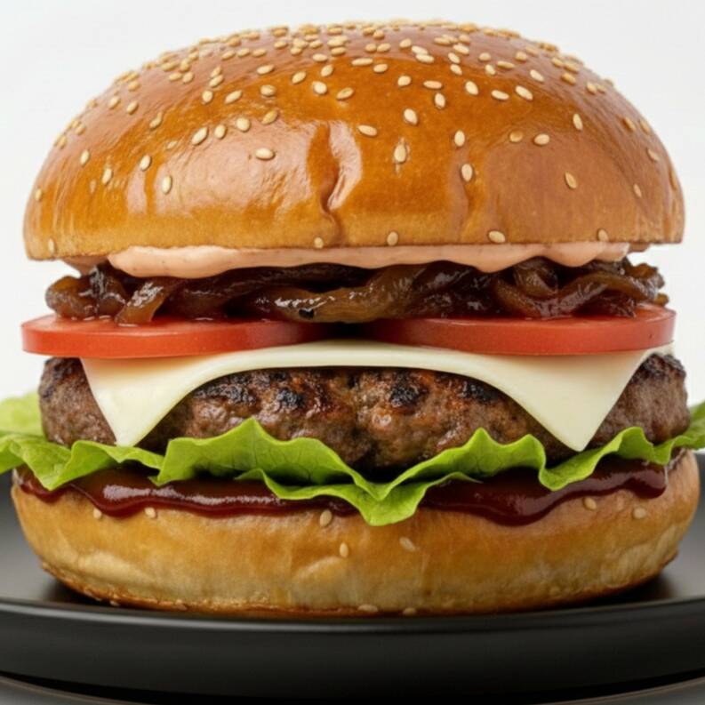 Pan brioche, salsa de ajo, lechuga, tomate, cebolla caramelizada, carne Angus (100 gr), queso, salsa sweet smoke..
