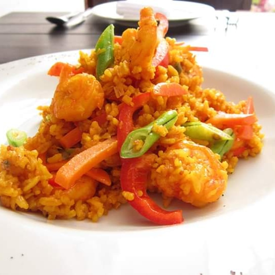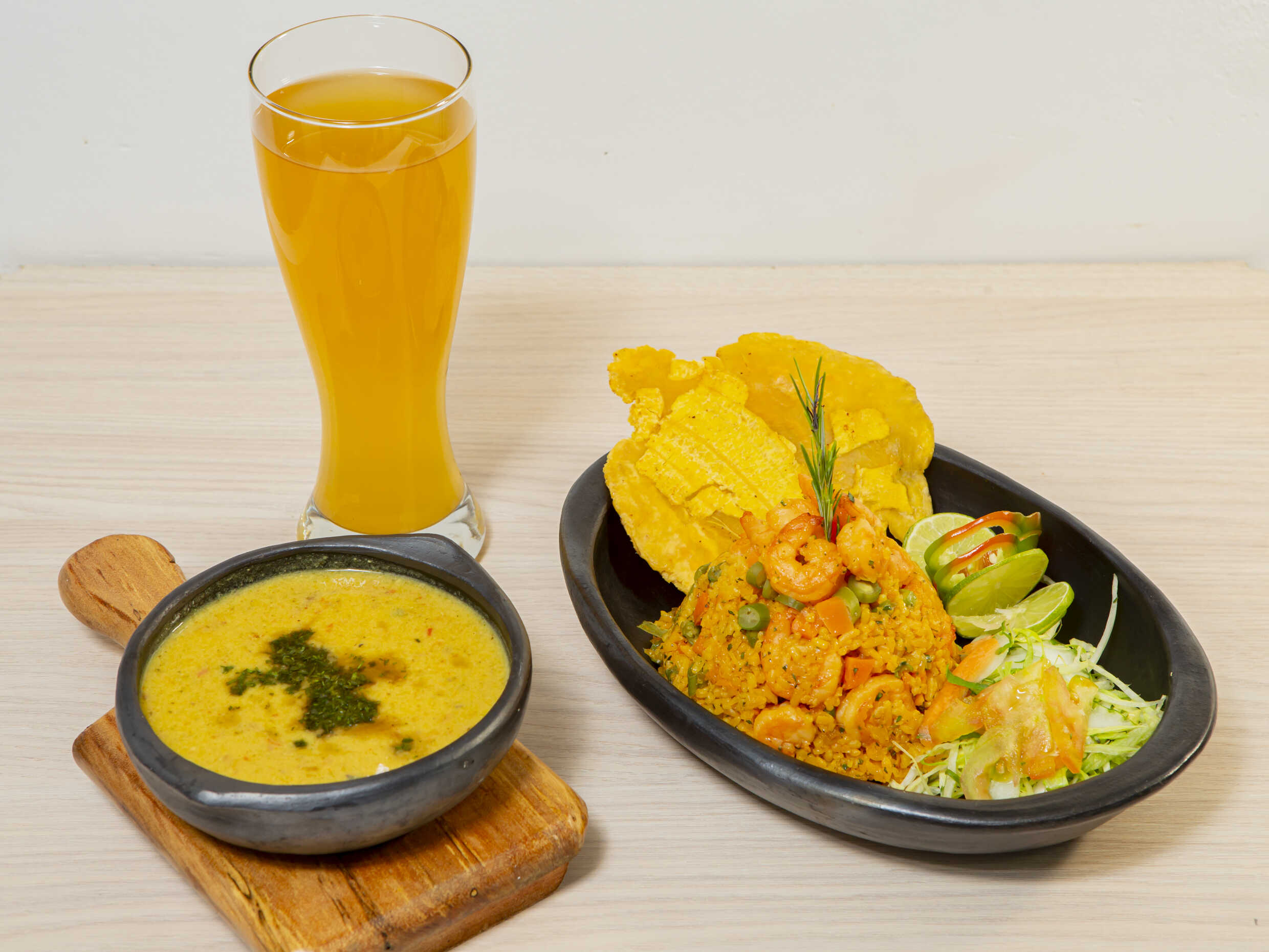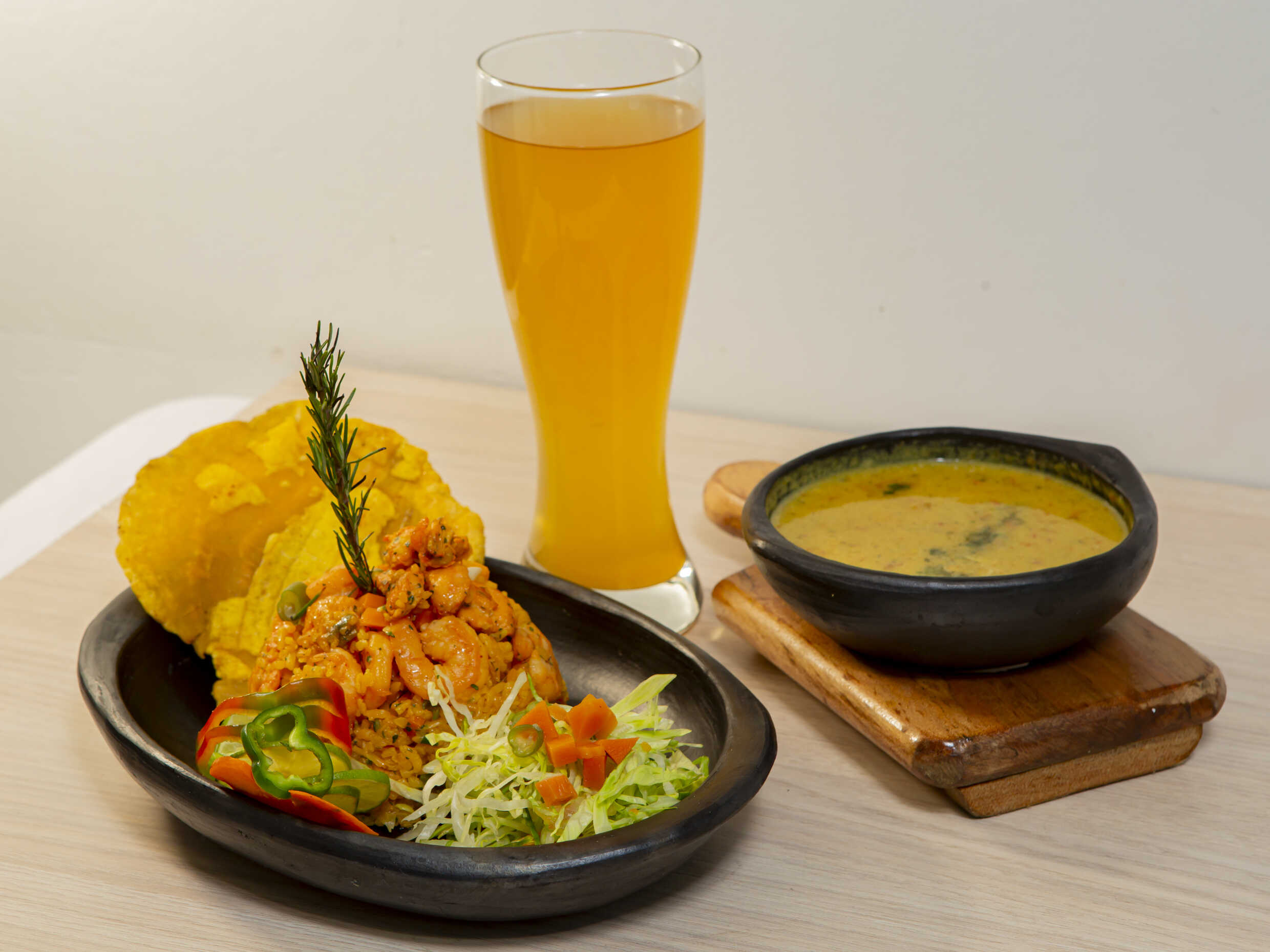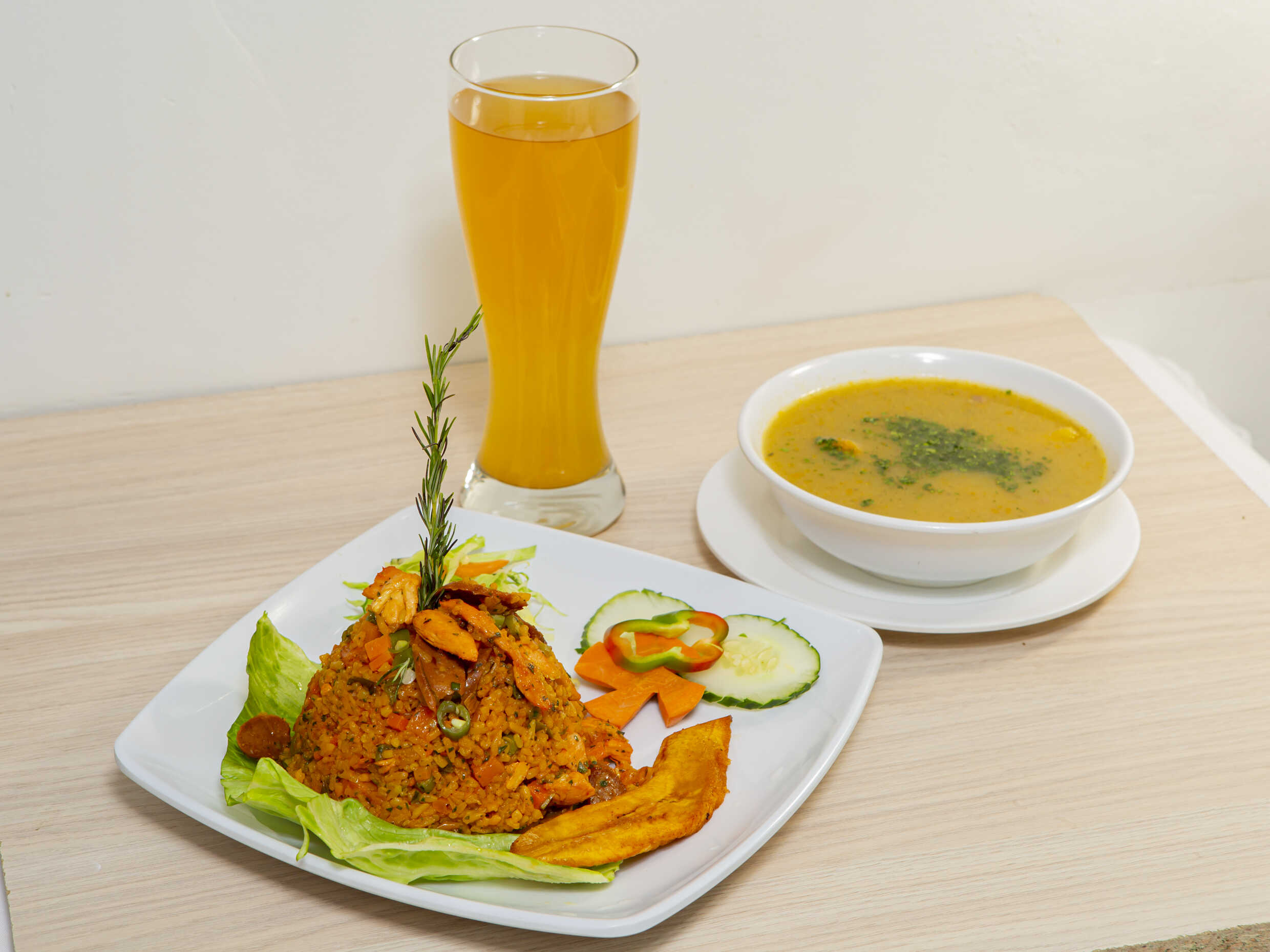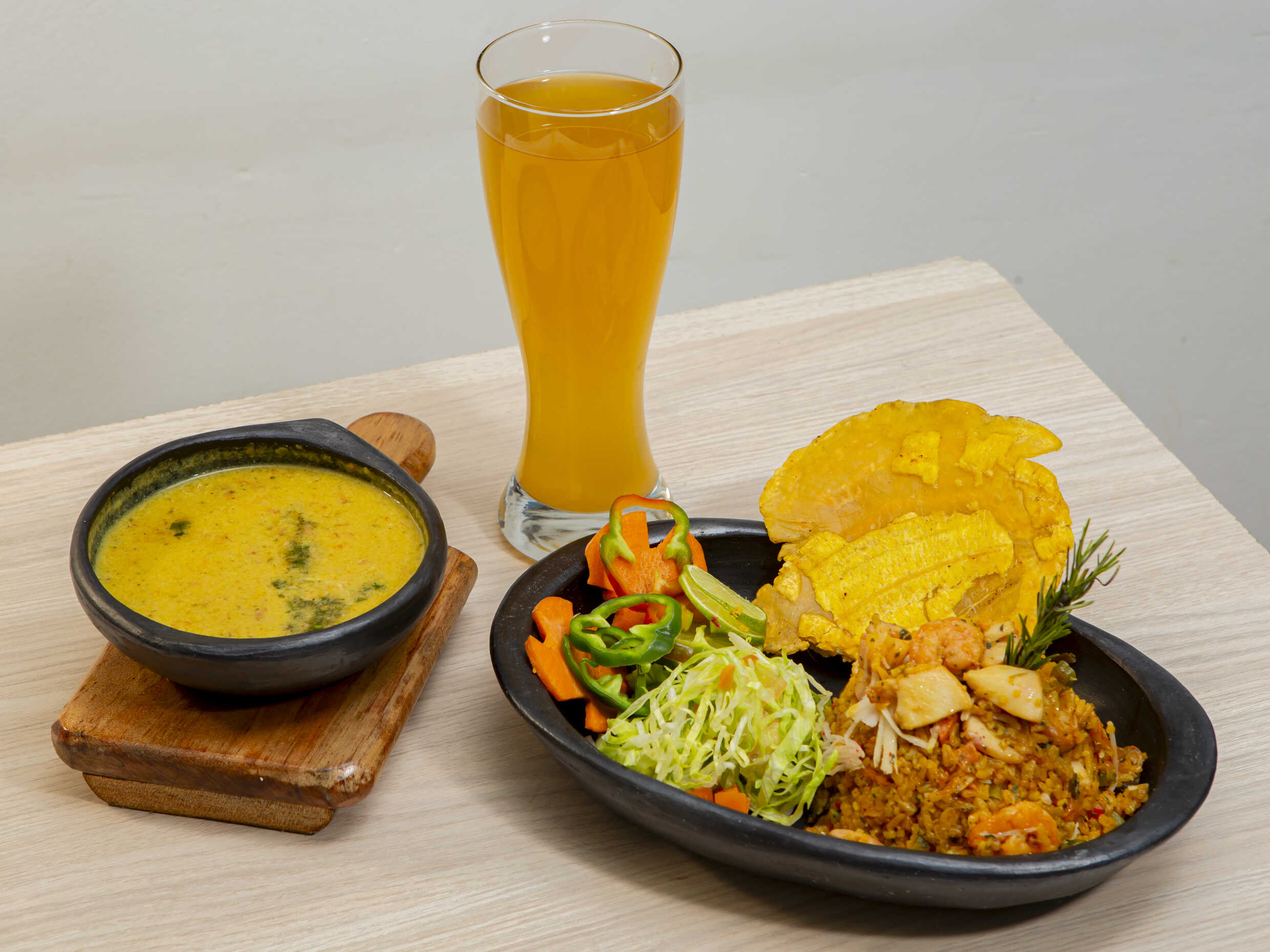 Arroz con Verduras y Camarones, acompañado de Patacón, ensalada, sancocho de Pescado y Limonada