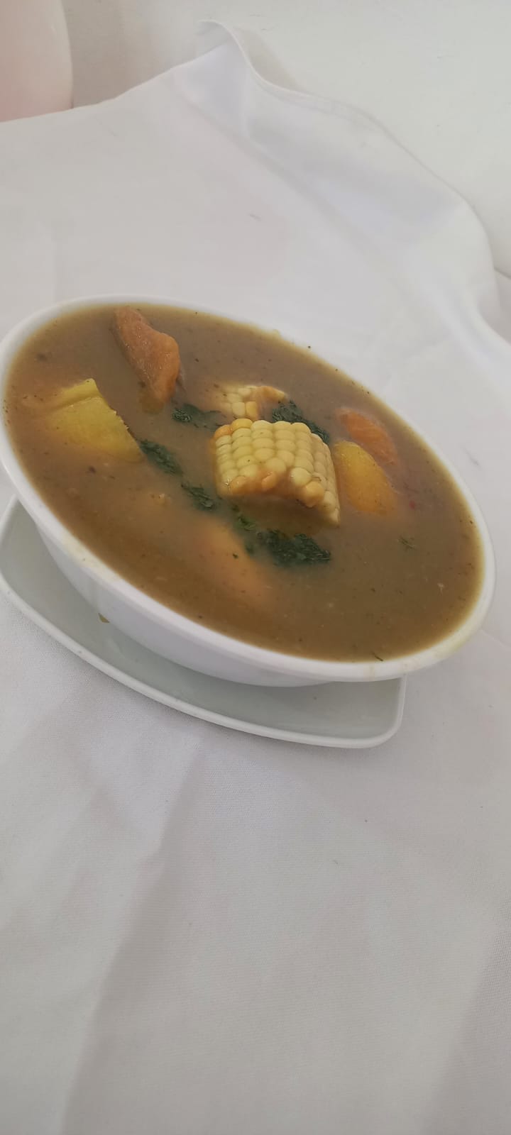 Mix de mariscos Con pipilongo. Acompañado de Sancocho, patacón y ensalada