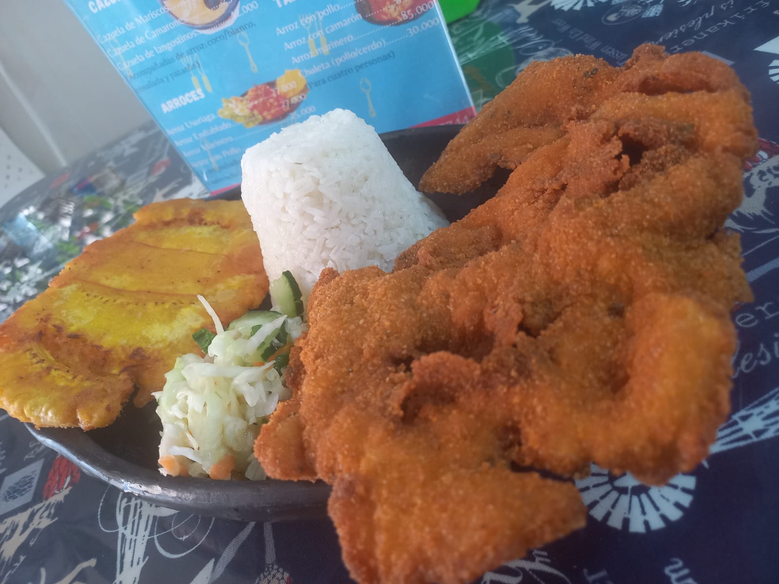 Chuleta de Pescado acompañada de sancocho de pescado, arroz a elección, ensalada, patacón y limonada de la casa a base de panela
