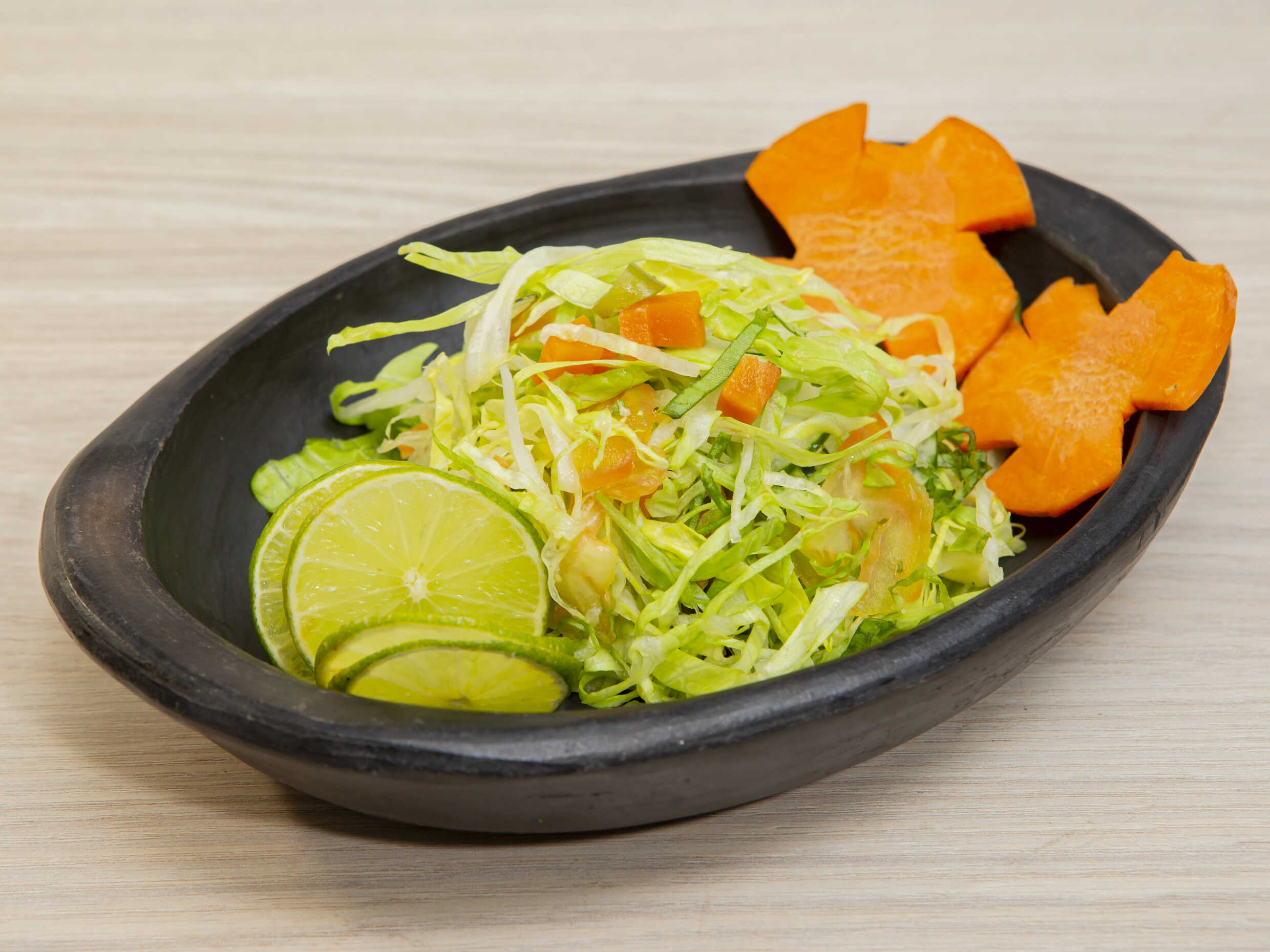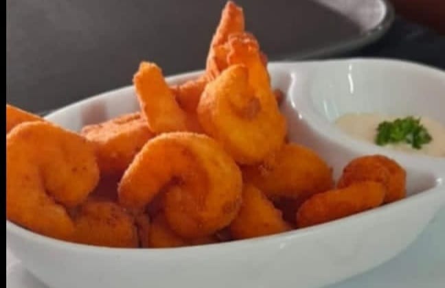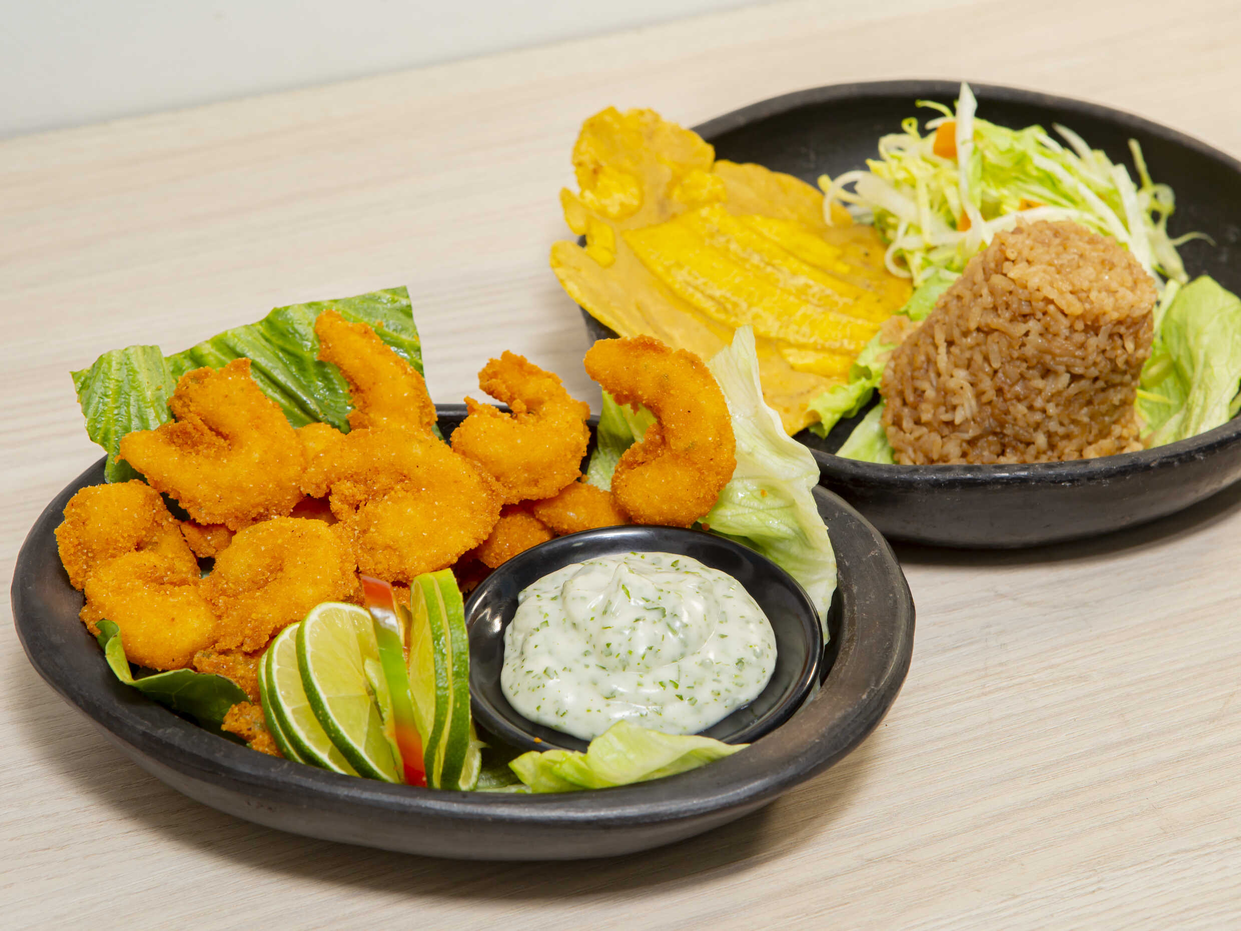 Camarones Apanados Bandeja Completa: Camarones apanados acompañados de arroz a elección, ensalada, Patacón y salsa tartara. + Cazuela de Camarón: 200 g Camarones en crema de leche de coco, acompañado de arroz, ensalada y patacón. Acompañados de Dos Limonadas a base de panela y limón