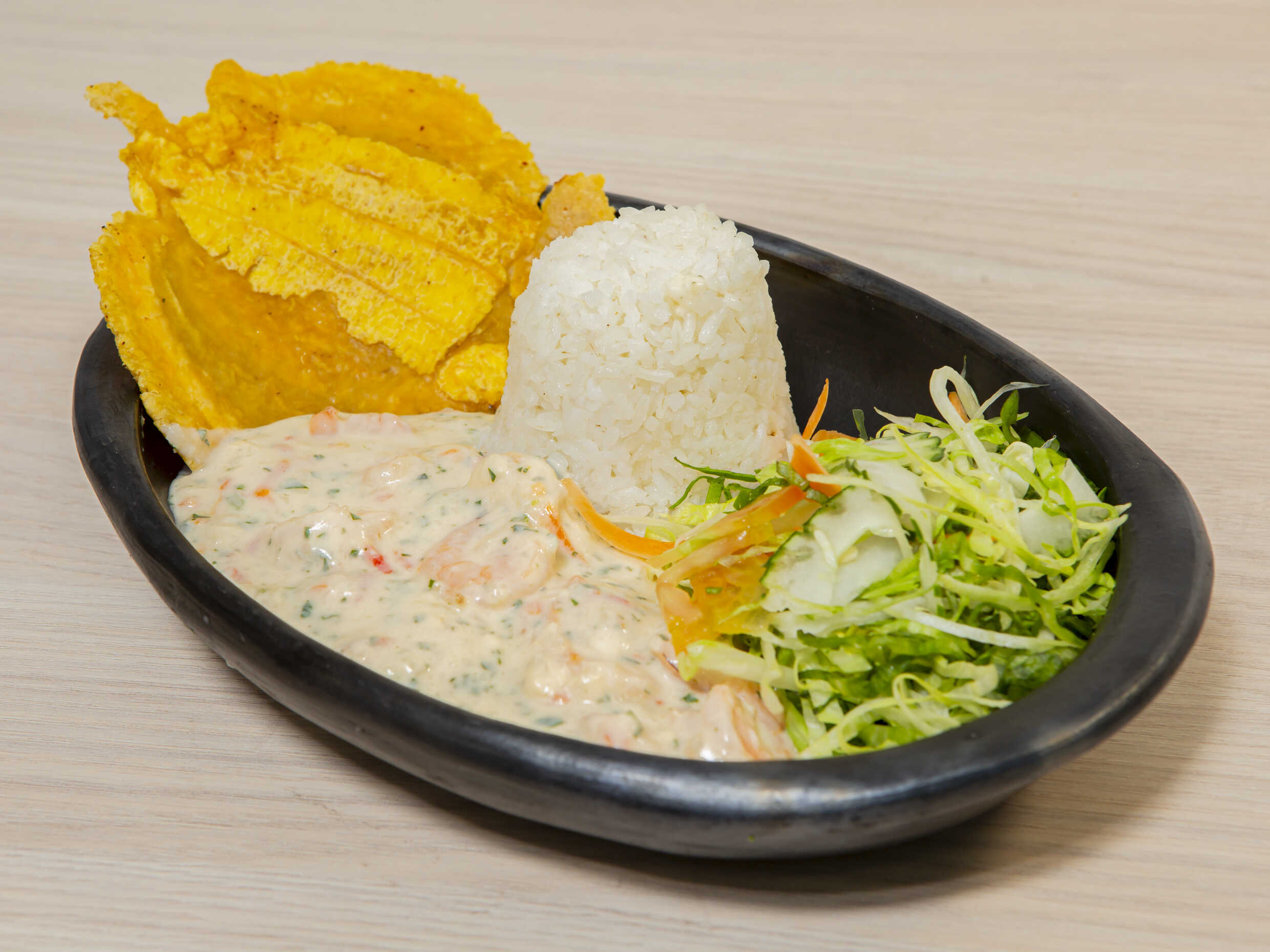 200 g Camarones en crema de leche de coco, acompañado de arroz, ensalada y patacón.
