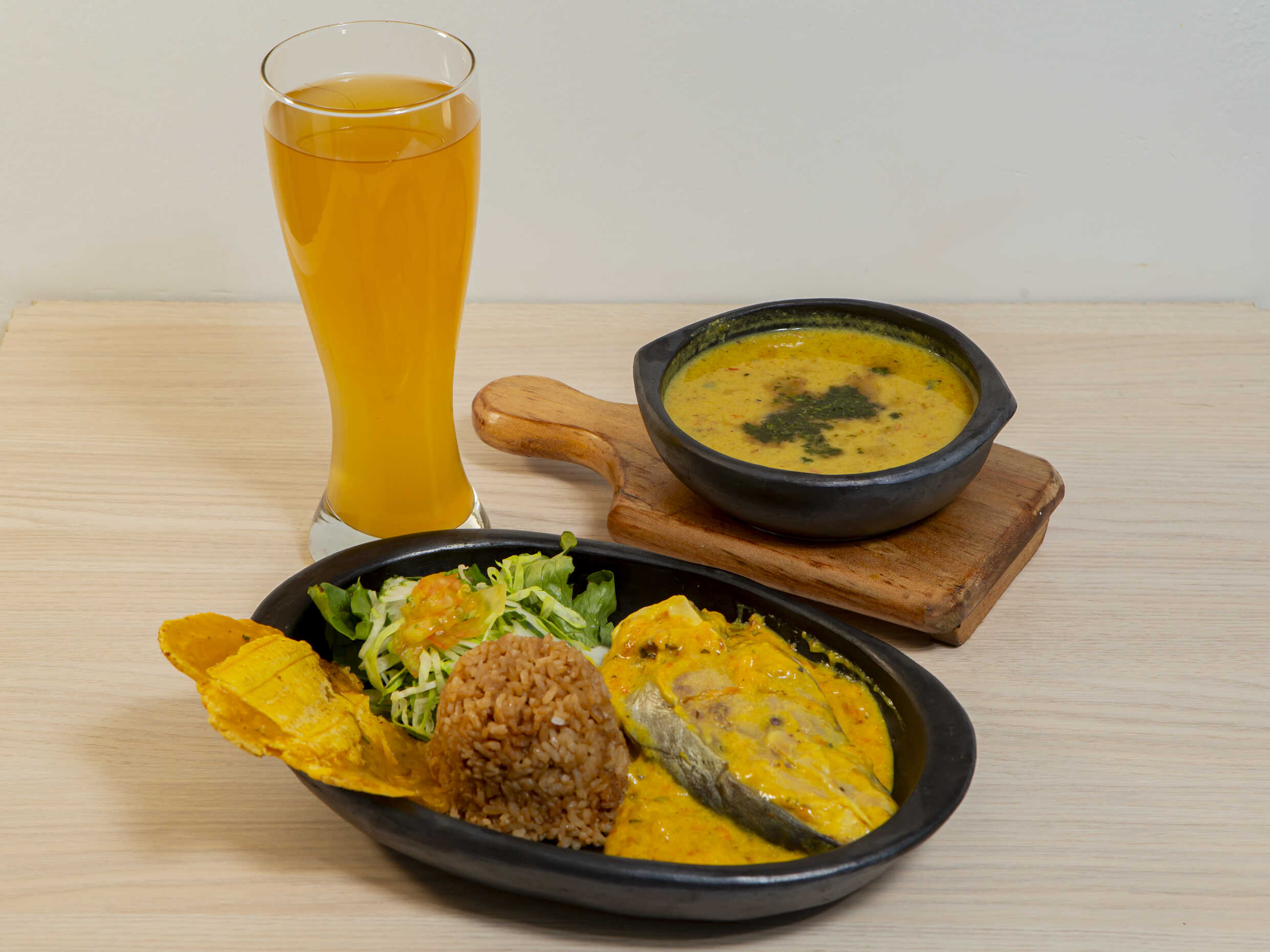 Pescado Sudado acompañado de Sancocho, Arroz a elección, Patacón, Ensalada y Limonada