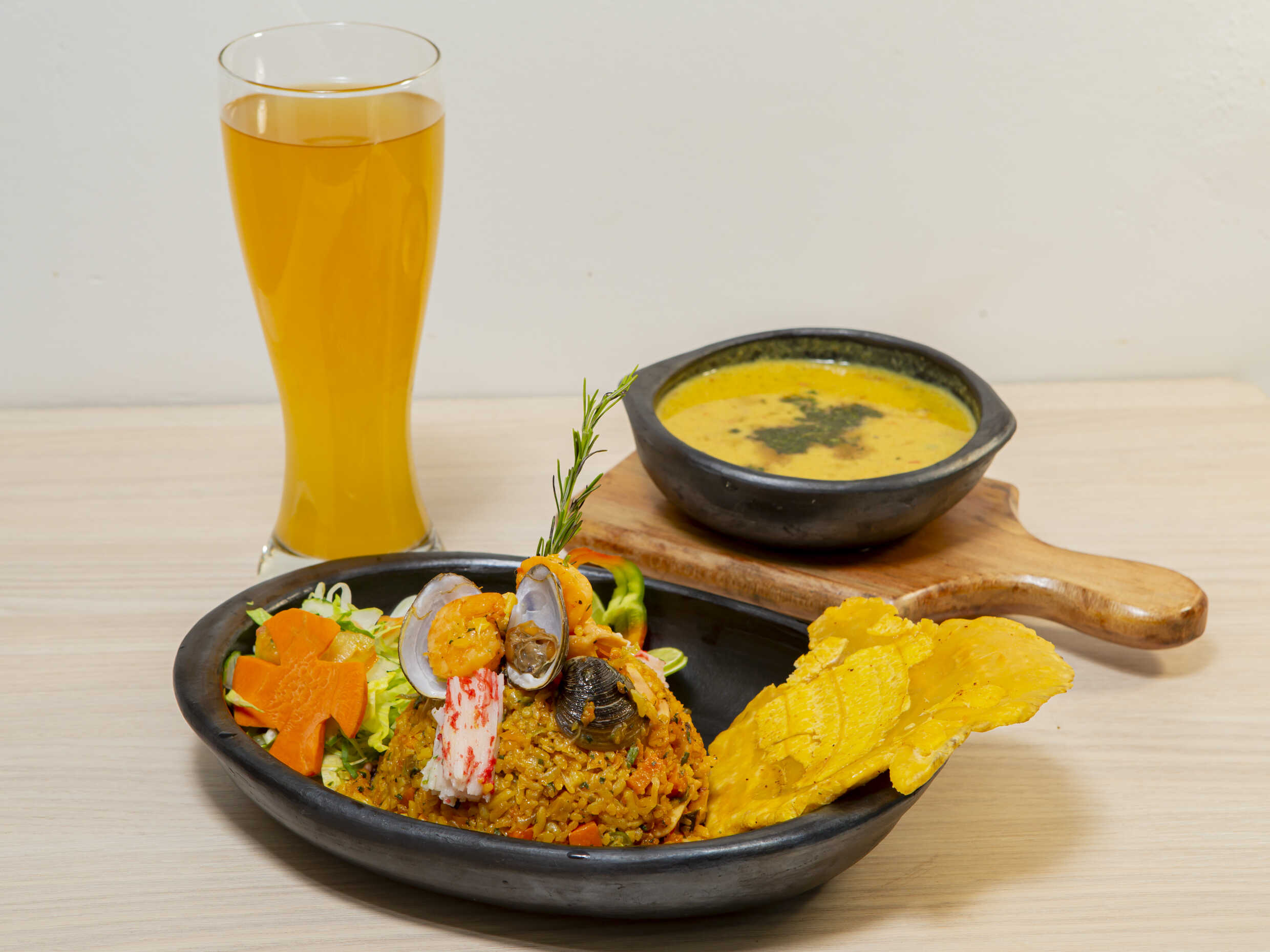 Arroz con Mariscos, acompañado de ensalada, patacón, sancocho y Limonada.