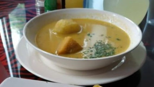 acompañada de Arroz, ensalada, patacon y sancocho de pescado